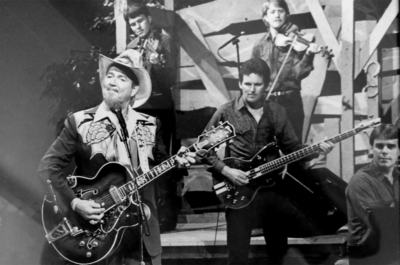 Hank Thompson on the set of Hee Haw with Shelby Eicher, Rodney Lay, Kenny Putnam and Chris Gage